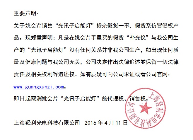 “光讯子启能灯”是款独特的补充元气提升自愈力的方法的理疗仪。是我公司科研人员十几年来不断研发创新的前沿高科技发明成果。因它的独特功用,近来公司陆续接获客户反映市场出现盗用“光讯子”知识产权和仿冒“光讯子启能灯”行径。对此损害我司名誉和侵权的恶劣行为,我司给予严厉谴责,同时我司保留追究法律责任的权利。由此侵害消费者健康利益产生的恶劣后果由不法者自行负责。