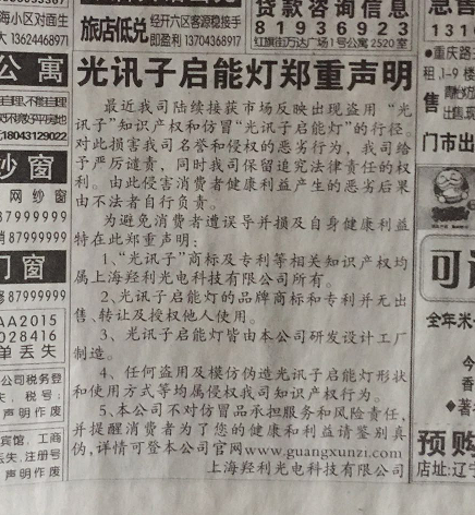 2、光讯子启能灯的品牌商标和专利并无出售、转让及授权他人使用。